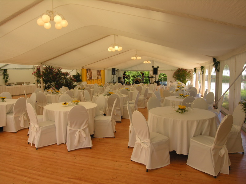 Seitenplanen bieten wir wahlweise mit oder ohne Fenster oder transparent an. Um das Zelt für Ihre Hochzeit oder Ihr Galadiner elegant wirken zu lassen, können wir es auch mit einem Innenhimmel ausstatten.