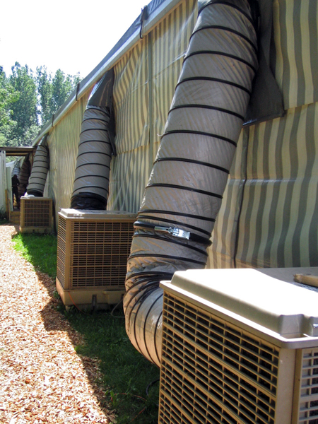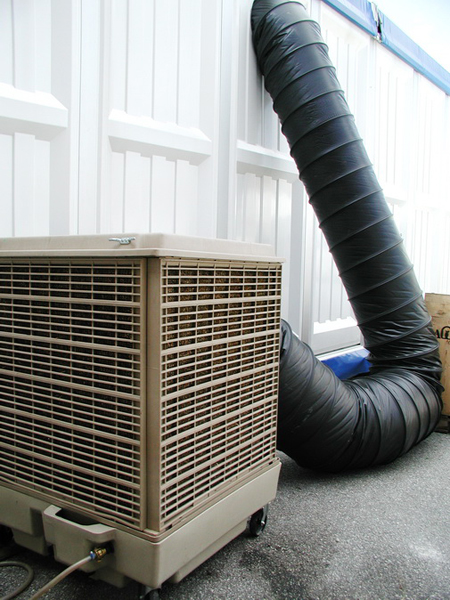 Die mobilen Verdampfungsfrischluftkühler nutzen den natürlichen Verdunstungsprozess. So strömt ständig kühle, saubere Frischluft in die Räume. Zum Betrieb wird nur ein Lichtstromanschluss und Wasser benötigt.